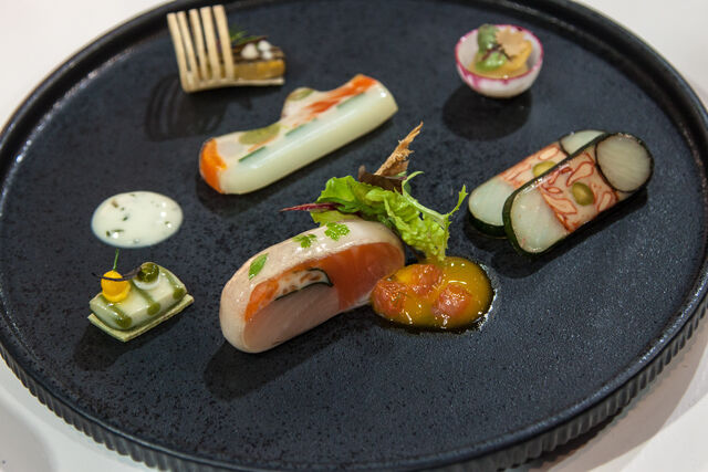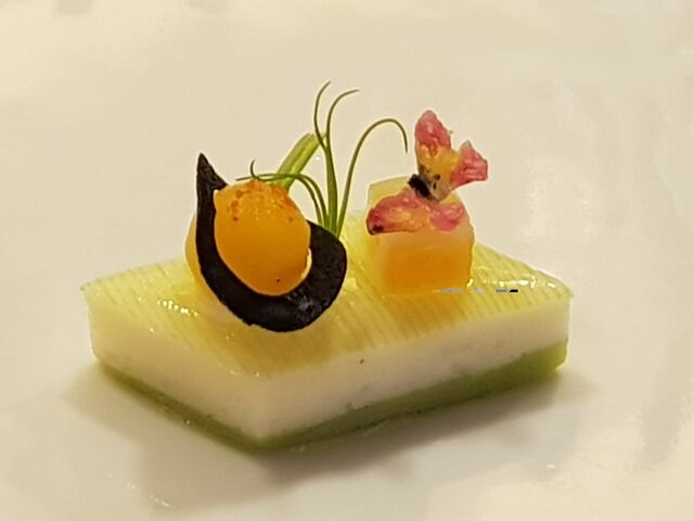 Finger food di Cialdini integrale con filetto di branzino alle cozze e gelee di cetriolo