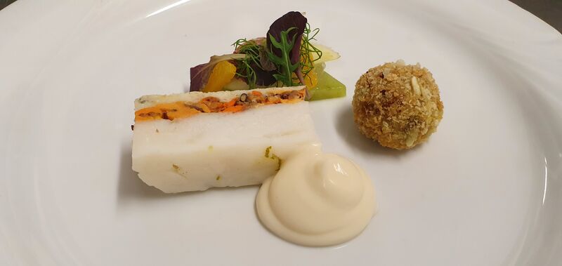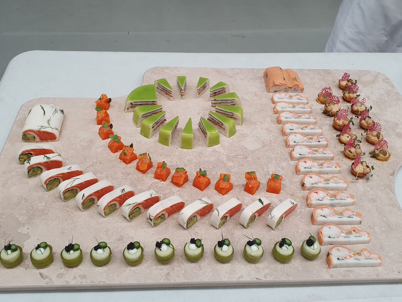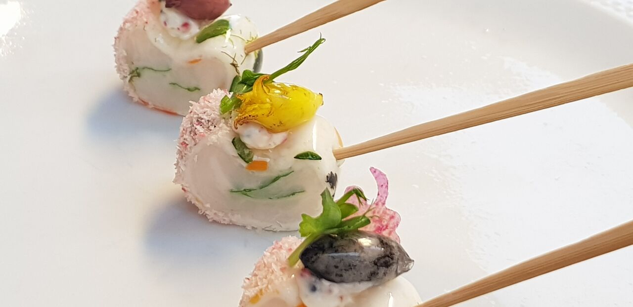 Finger food di Cialdini integrale con filetto di branzino alle cozze e gelee di cetriolo